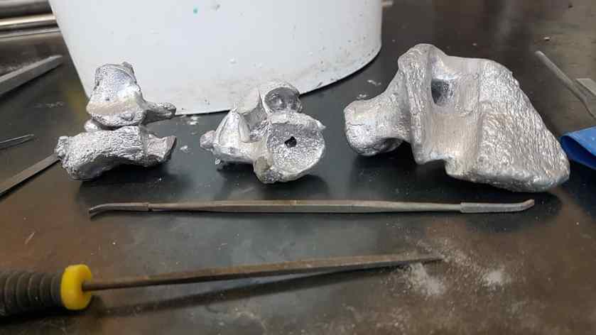 - I’m not sure if it will be doable to finish them in time, as the aluminium has proven much more difficult to work with than the bronze- most of the bones have holes where they shouldn’t where the metal shrunk in the mould, there are feathered bits and lumps where there shouldn’t be any and I’m having to work entirely with hand tools