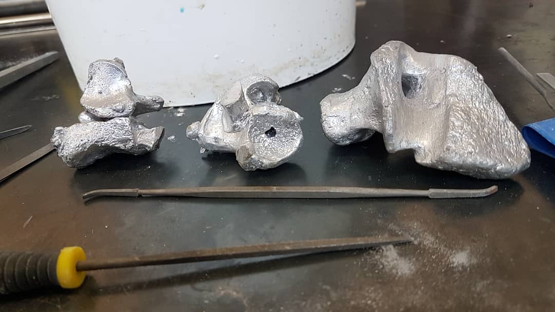 • I’m not sure if it will be doable to finish them in time, as the aluminium has proven much more difficult to work with than the bronze- most of the bones have holes where they shouldn’t where the metal shrunk in the mould, there are feathered bits and lumps where there shouldn’t be any and I’m having to work entirely with hand tools