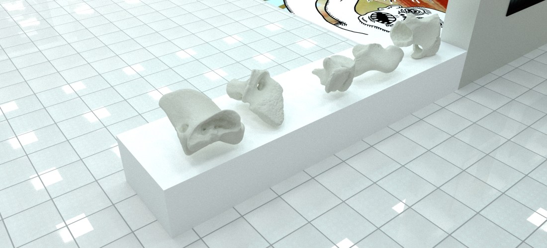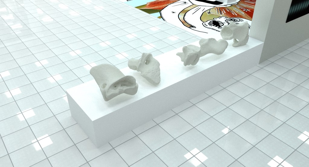 In terms of the digital work on screen I am very happy with how it looks- I have chosen one of the larger bones that has a particularly interesting form for the audience to play with, and I feel that Meshmixer was a good choice of programme for the audience to use, as it is fairly simple programme to mess around on- hopefully people will use it and enjoy playing around! I made a 2 minute video, which is on one of my earlier posts, which shows how to move around the 3D model, how to zoom in and out, and some of the basic tools they can use on Meshmixer, in case anyone gets stuck, and this is on the Mac desktop, titled “How to Use”.