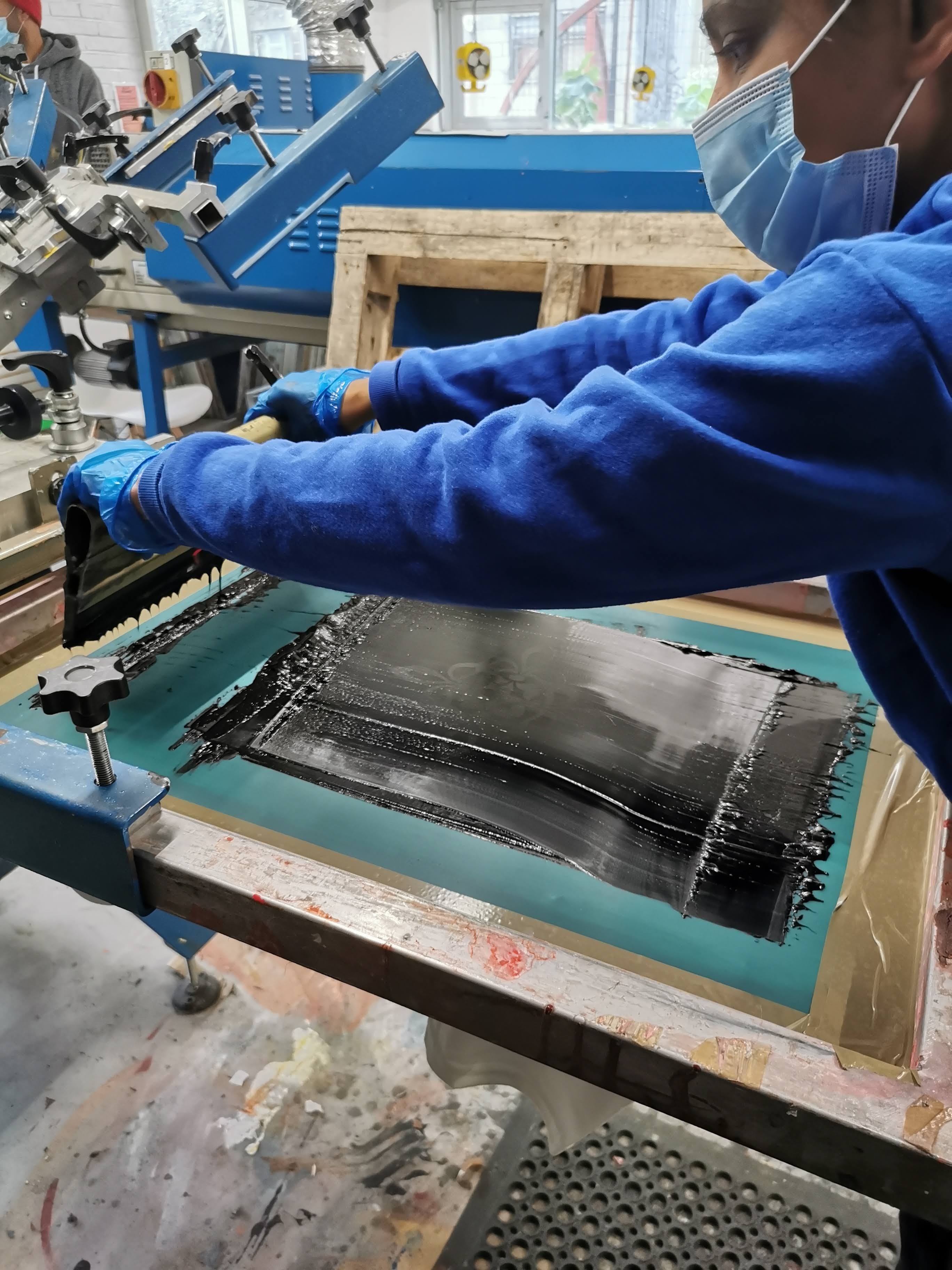 We started off in the morning by running through the plan for the day, then encouraging everyone to either draw their design, or give us their digital design to edit on Photoshop before we printed it onto film for them. This was our first post-lockdown workshop so of course we had a few changes to make the the way we usually run the workshops- everyone needed to wear a mask at all times, we encouraged students to bring their own cups for hot drinks, and we offered gloves and hand sanitiser as well as adding extra cleaning into the day. We showed the students how to clean a screen ready for coating, and then we demonstrated how to coat a screen- usually we would then have each student coat their own screen, but to minimise the risks we had all the screens ready coated (apart from the demo screen we used). We then got everyone to bring in their artwork either on film or trace and lead them through the process of exposing artwork onto the screens and washing the emulsion off. Once the screens were in the dryer we then moved onto choosing and mixing colours, before breaking for lunch.