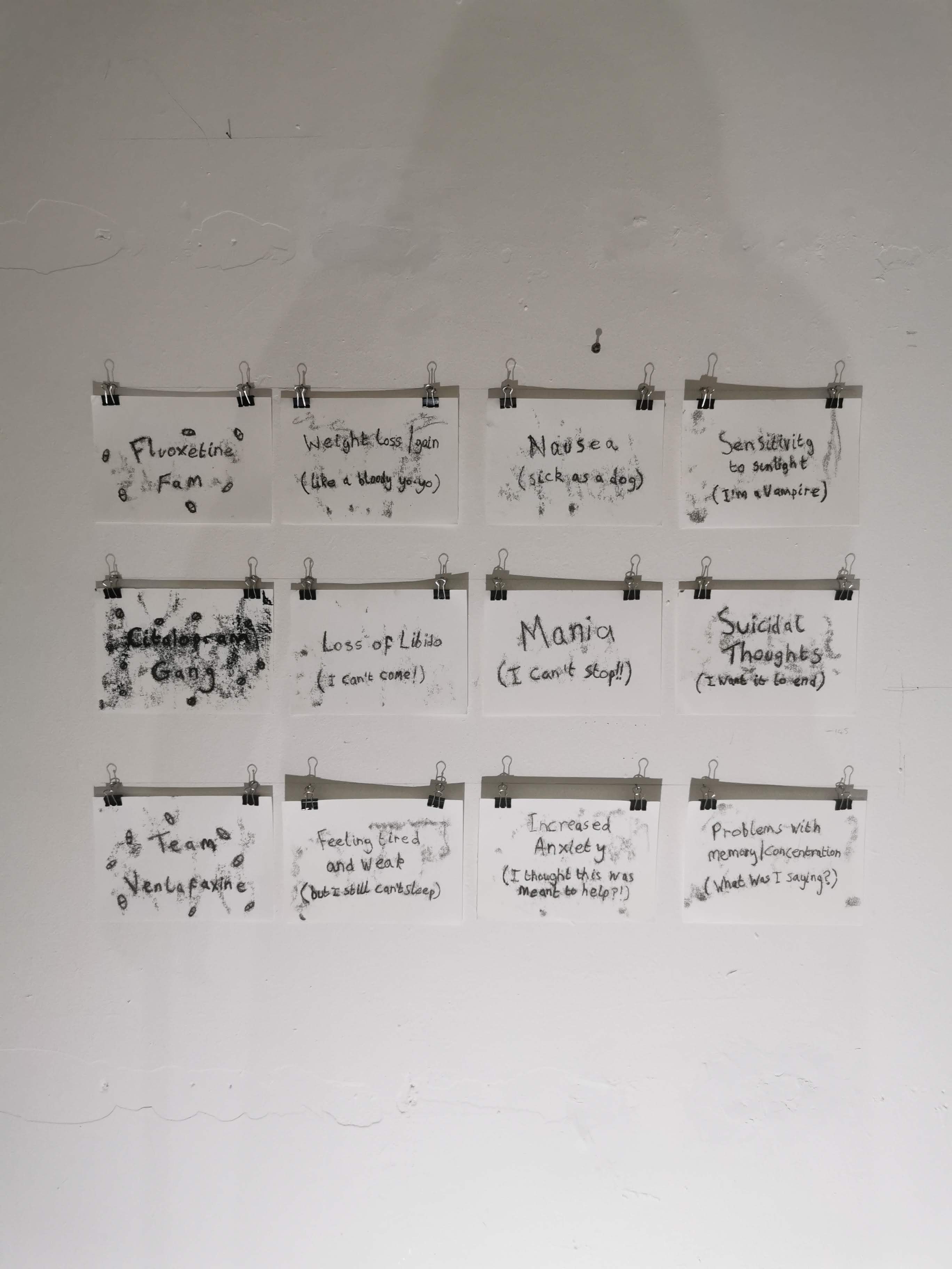 I decided to show the antidepressant monoprint series SIDE EFFECTS that I created during lockdown, as it was some of my more recent work that I felt was “finished” (as far as a project or piece can ever really be considered “finished”) and because I feel that the topic is something that isn’t talked about enough outside of the medical practice. It was very exciting getting to be part of an exhibition in person for the first time since 2019, especially surrounded by work from my peers and friends from the Database, many of whom I had only met online so far! I opted to keep the presentation of my work simple, with nails and bulldog clips securing each print to the wall, as the whole show had a low budget kind of feel and I felt that framing the prints might make them feel lost or too cluttered. I also chose to leave one of the prints out, as 12 is a better number to show than 13, and as it felt like it said something similar to another one in the series and I didn’t want it to feel like I was repeating myself.