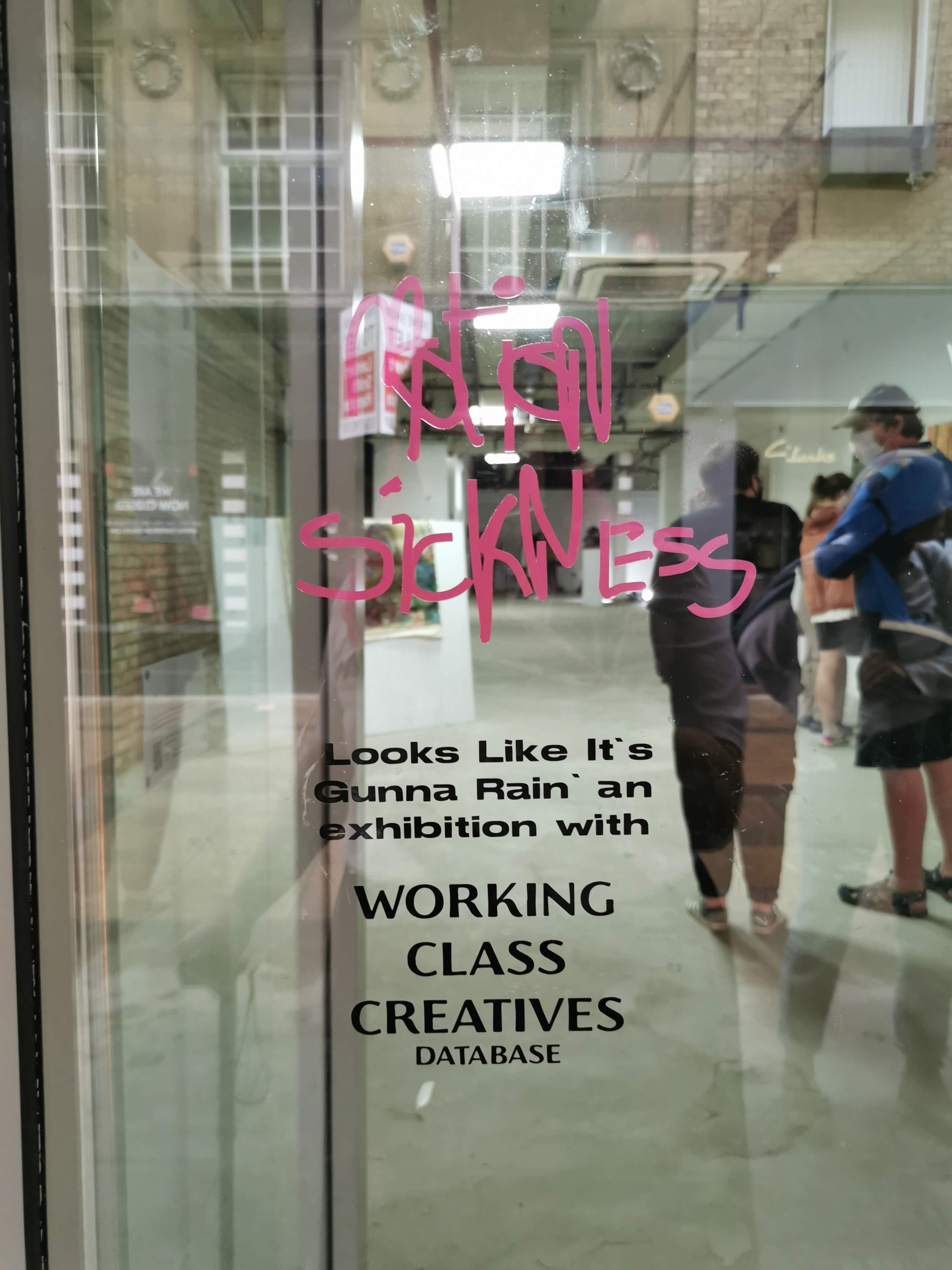 Cambridge based collective Motion Sickness got in touch with the Working Class Creatives Database with the opportunity to use their gallery space in a disused shop in Cambridge for an exhibition for our members- resulting in LOOKS LIKE ITS GUNNA RAIN, a group show from a range of artists from across the uk who are all part of the Database.