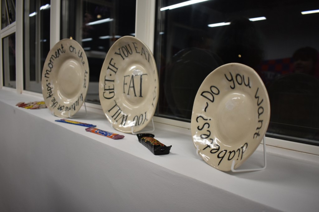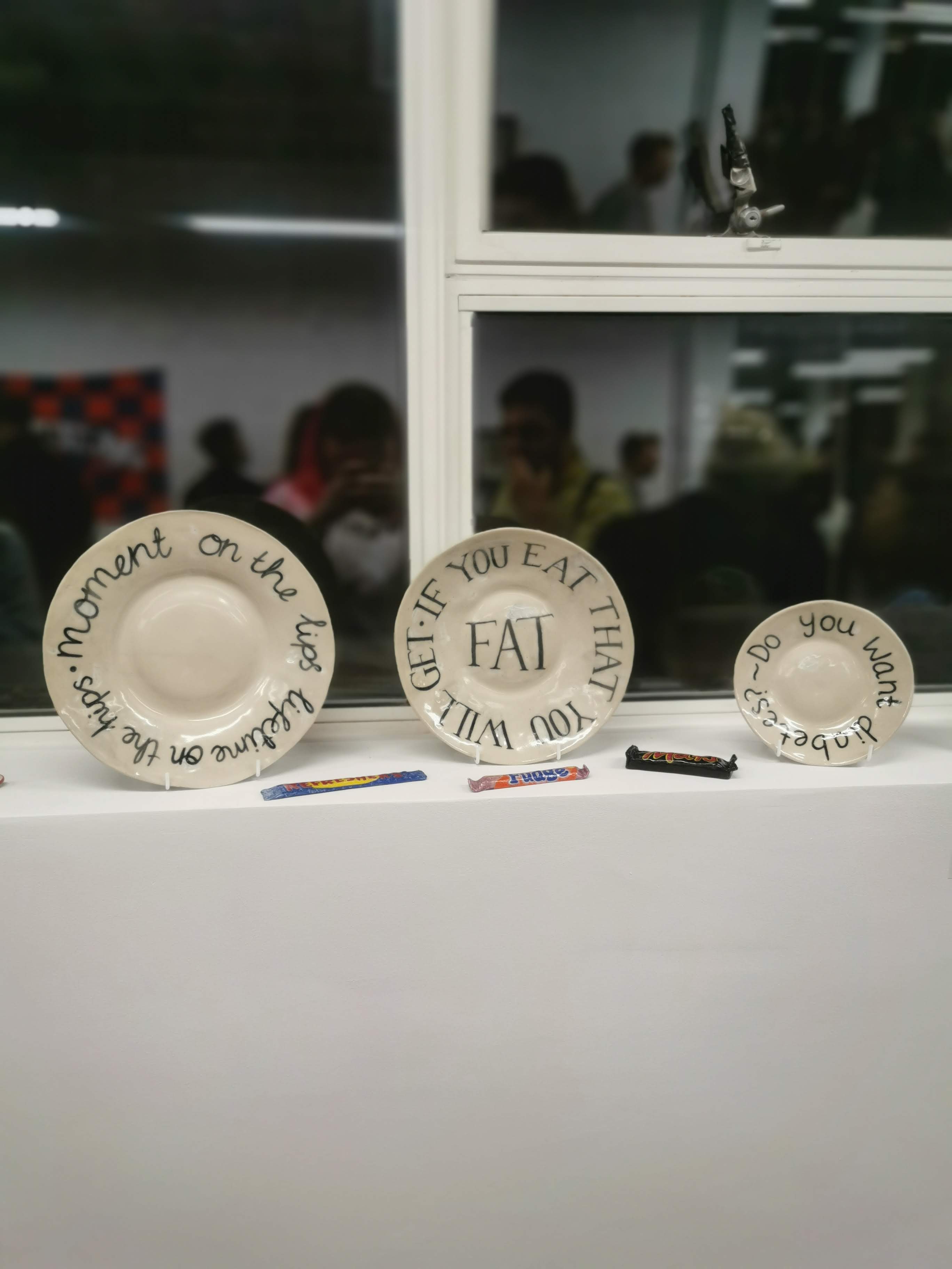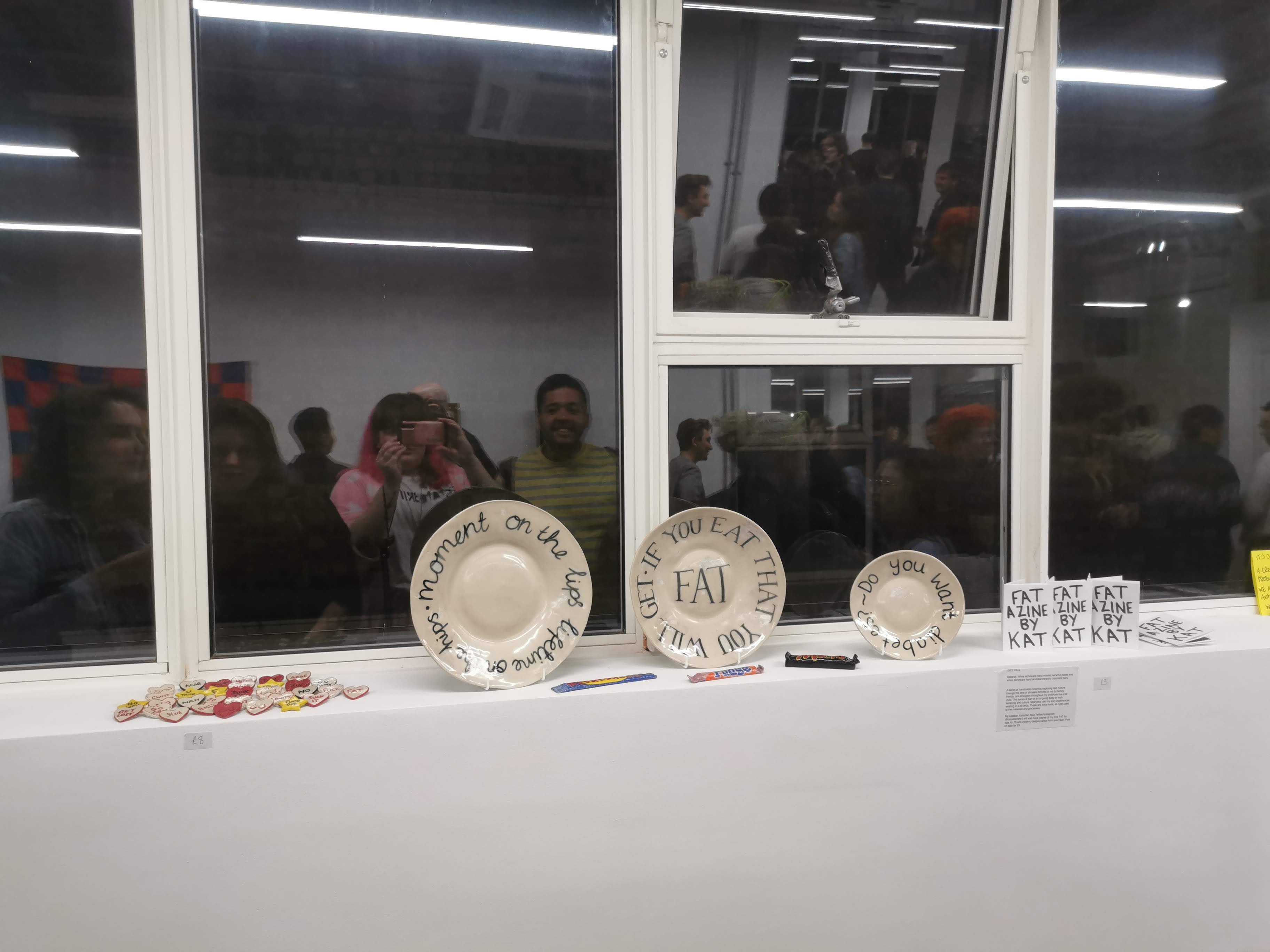 I showed three plates and three ceramic sculptures- all new works made in the last few months as part of my FAT project, titled DIET TALK. the plates and sculptures are from two different strands of the FAT project, brought together as I felt they tied in well and worked together as part of the theme. I also had a selection of handmade ceramic pins and smaller copies of my FAT ZINE on sale during the exhibition.