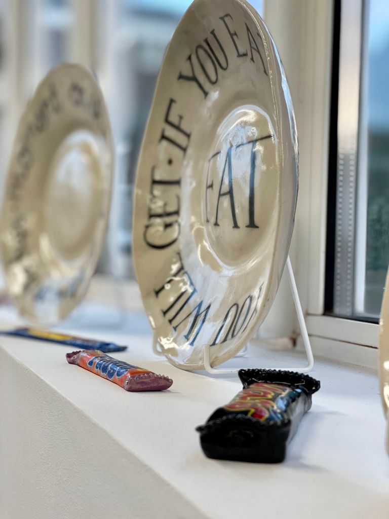 “A series of handmade ceramics exploring diet culture through the lens of phrases directed at me by family, friends, and strangers throughout my childhood as a fat child. This series is part of an ongoing body of work exploring diet culture, fatphobia, and my own experiences existing in a fat body. These are initial tests, as I get used to the materials and processes.” – DIET TALK work description