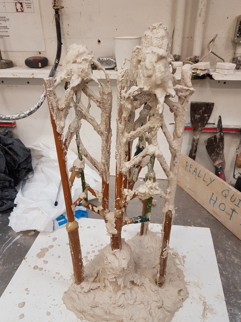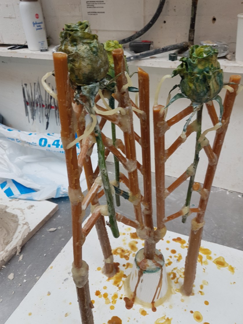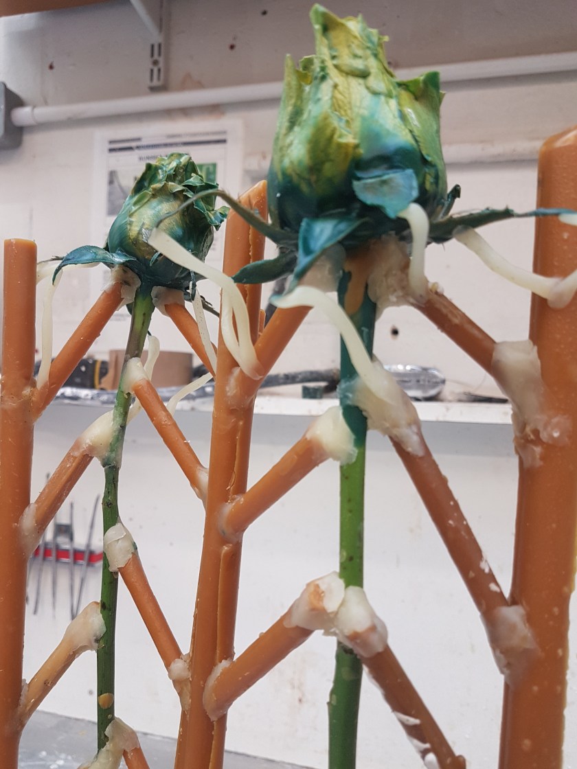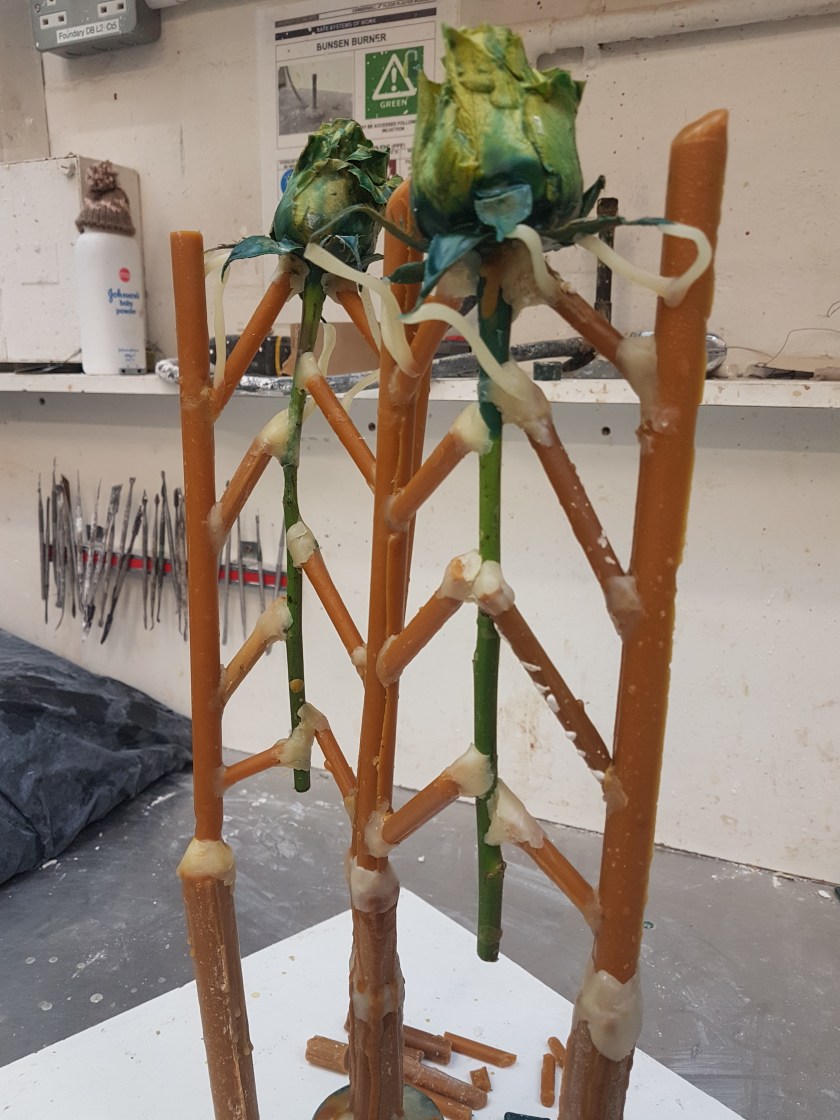I am putting the leaves to one side for now, they have been dipped in wax so they should stay in a usable condition over the break. The above photos show the process of prepping the wax dipped roses to go into a plaster mould- Lindsey was showing me how to do it in a different way from how I have previously made moulds with Becky, essentially working the opposite way round- you can see one of the roses attached to the cup, and the cup attached to the board. Once all three roses have a system of runners and risers they will be attached to the cup in the same way. The next steps will be to degrease it all, put a cylinder around the whole structure, and pour the plaster mix into it to make the mould for the kiln.