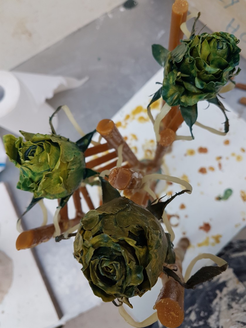 Today I got the third and final rose ran up, then attached to the cup with the rest using hot knives and wax. Then I painted a layer of shellac over everything, to help the grog to stick to it, and once it was dry I covered it all in first coat grog.