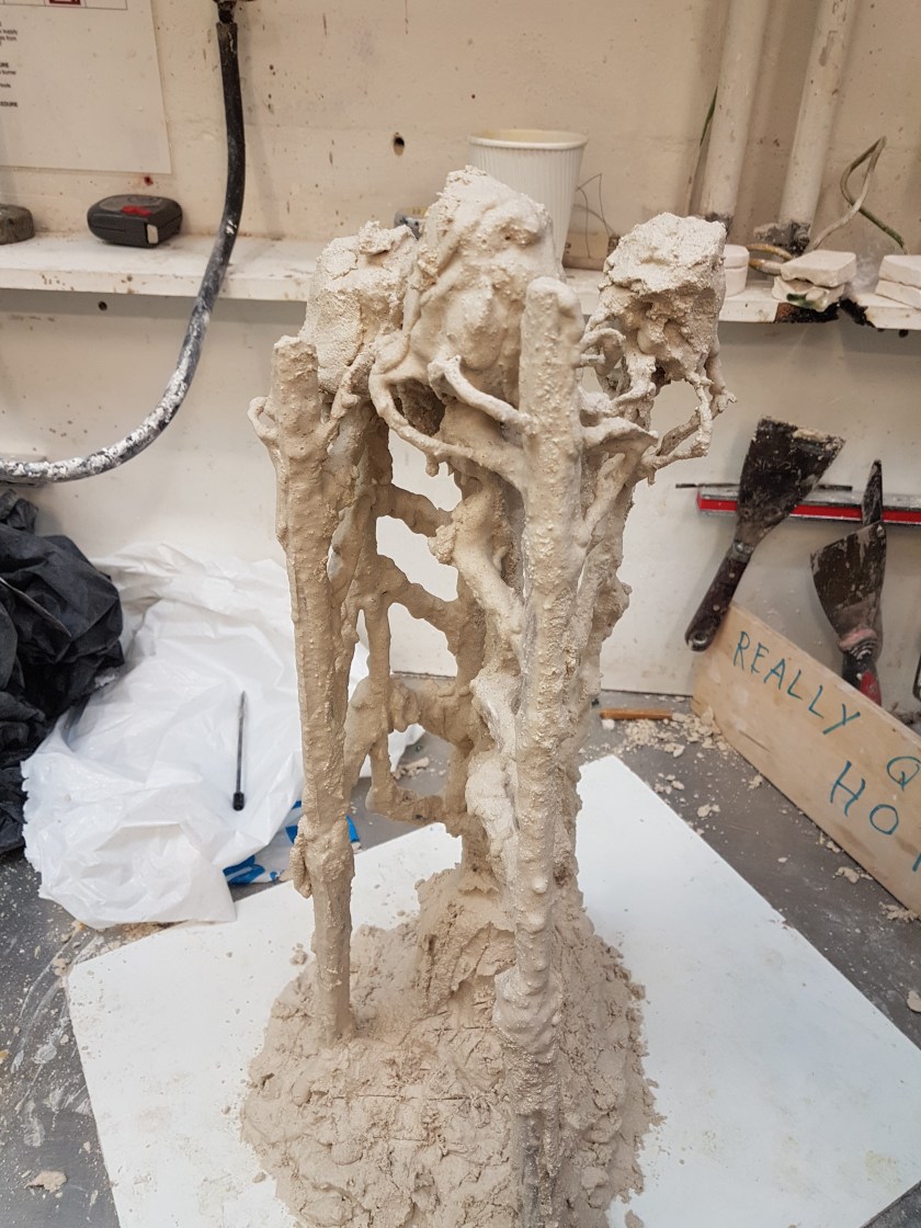 This video shows part of the clean up process- once the casts had been removed from the mould, the rest of the plaster still needed to be removed from around the casts. It has been sped up by about 250%, as the original video was 20 minutes long, and I wasn’t sure if anyone would want to watch it! As they were too big to be secured in a clamp at this point I had to secure them with pieces of brick, so that they were stable enough to use the hammer and chisel on.