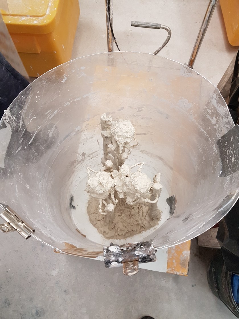 Before the moulds could be fired in the kiln, Becky removed the plastic from the outside (that we had used to make the moulds, as seen in previous posts, and the brick video). We then had to cover the sides and bottom of each mould with layers of scrim coated in plaster, to create a protective barrier to stop the plaster moulds falling apart in the kiln- four of us did this, and I didn’t take any photos as it was very messy! But you can see the moulds with their plaster coating in the above photos. The moulds then went into the kiln upside down, as you can see in the photos. They go in upside down so that as the mould is heated and the wax inside melts it will flow out of the mould, leaving empty spaces where the metal will then be poured.