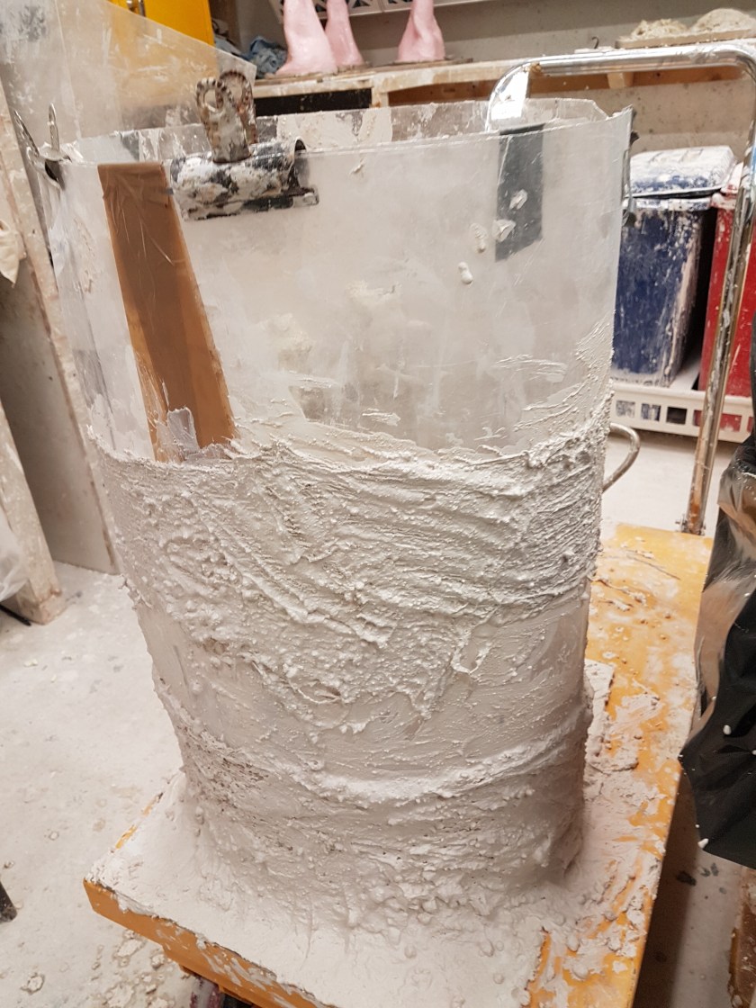 Once that had set we put the plastic cylinder over it all, and I layered scrim (netted fabric) and plaster along the bottom, to seal the cylinder to the board, and around the middle of the cylinder for stability. As soon as this was set I spent the rest of the afternoon mixing and pouring second coat grog, to fill the entire cylinder to make the mould ready for the kiln.